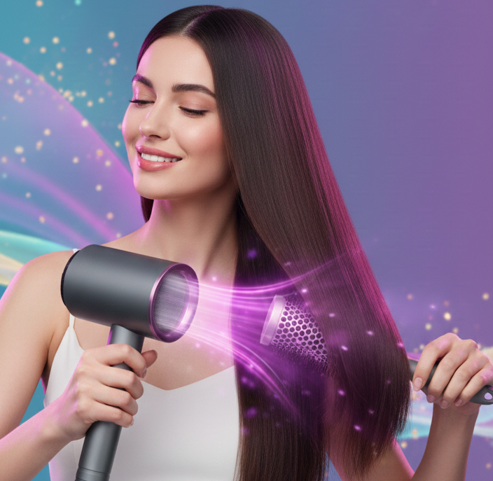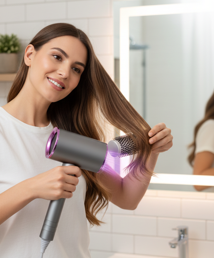 Sí. Los iones negativos sellan la cutícula, lo que potencia el brillo natural del cabello sin necesidad de sérums ni tratamientos adicionales.